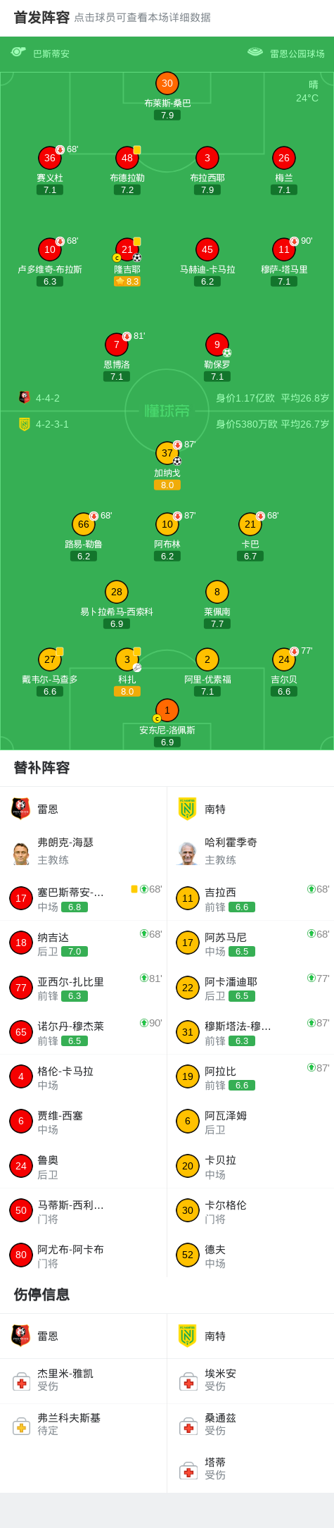 北京时间4月26日法国足球甲级联赛第31轮,雷恩主场对阵南特。比赛中,雷恩球员勒保罗率先通过点球得分,随后南特球员在队友助攻下由加纳戈扳回一球,补时阶段雷恩球员隆吉耶再入一球锁定胜局。最终比分雷恩2-1南特。