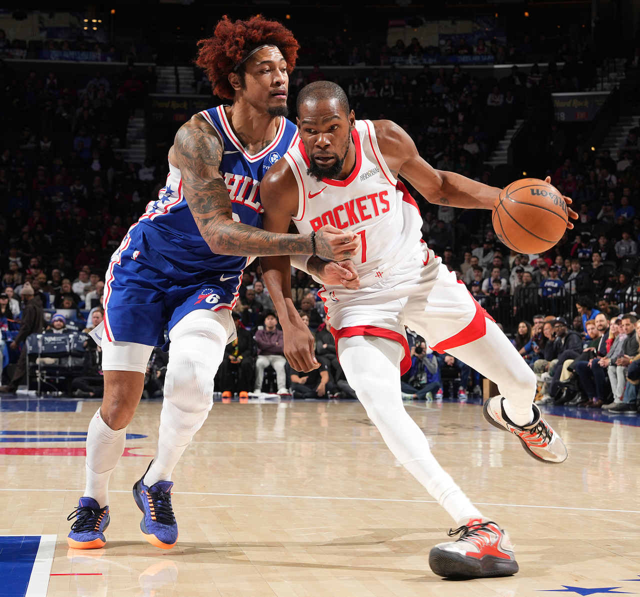 加时赛开场费城一波5-0,关键球还是杜兰特外线干拔三分球,申京篮下被乔治大帽,杜兰特边线推人被吹进攻犯规,杜兰特两个续命三分没中但火箭拼下前场篮板杜兰特两分命中,阿门继续失误比赛完结。